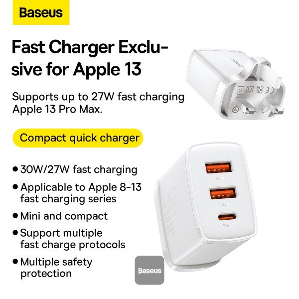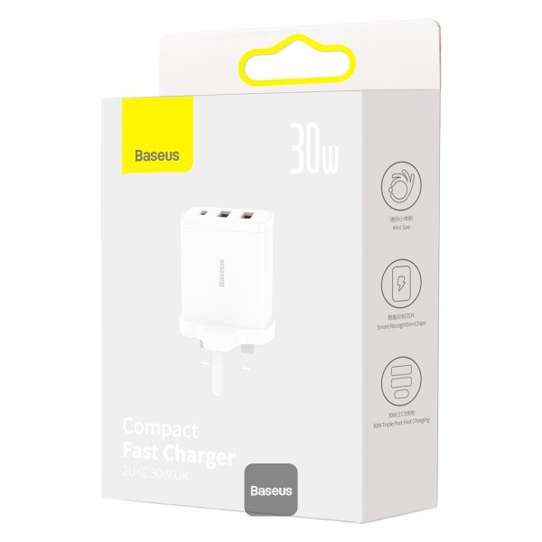 Baseus Compact Fast Charger 2U+C 30W UK WHITE-(1YW)