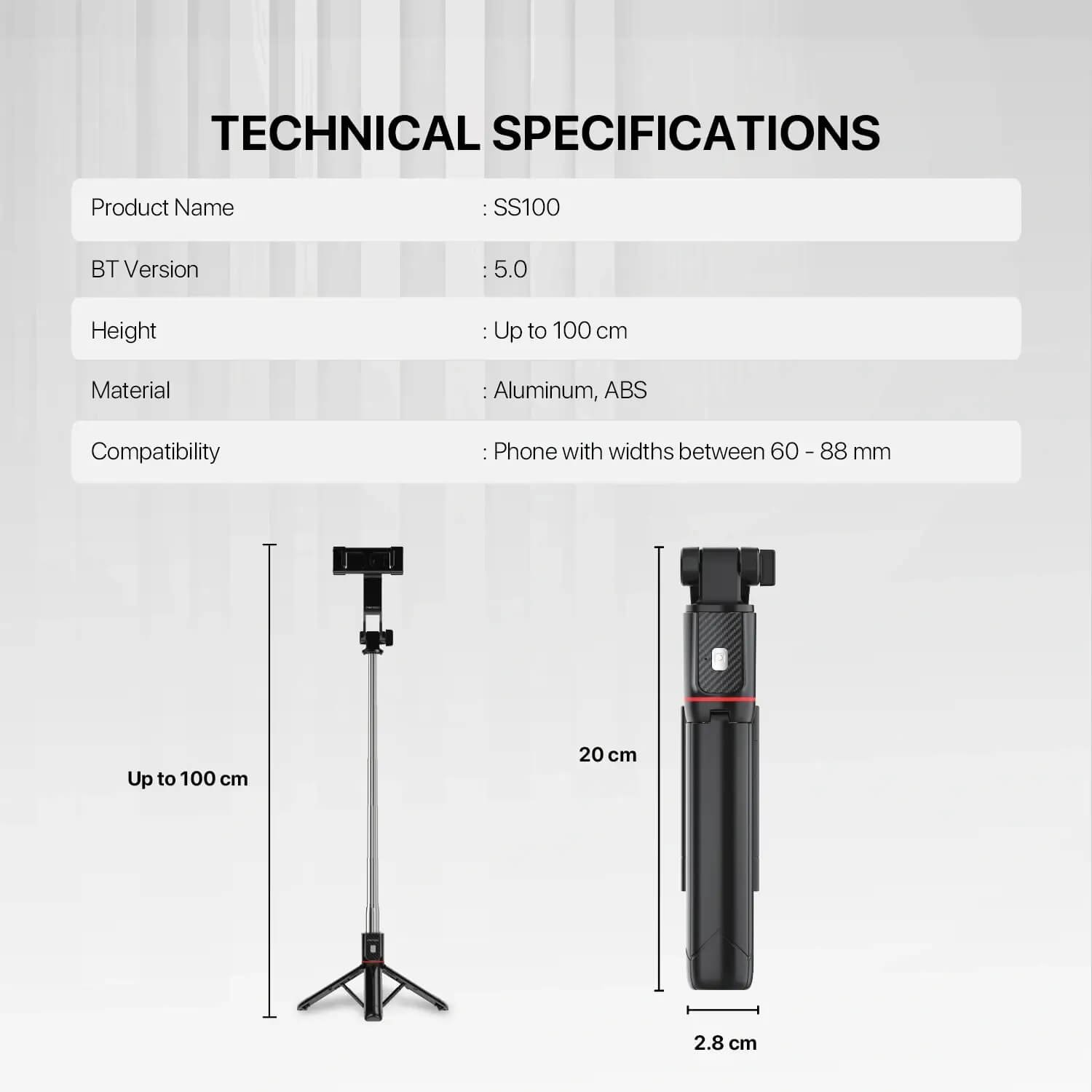 With its extendable length of up to 1 meter and 360° rotating head, you can easily adjust the angle and composition for the best framing. The built-in Bluetooth remote control (up to 10 meters range) makes it effortless to take photos or record videos without needing to touch your phone. Crafted from a lightweight aluminum alloy and ABS materials, the SS100 is built for portability and stability—perfect for travel, vlogging, and everyday use.
