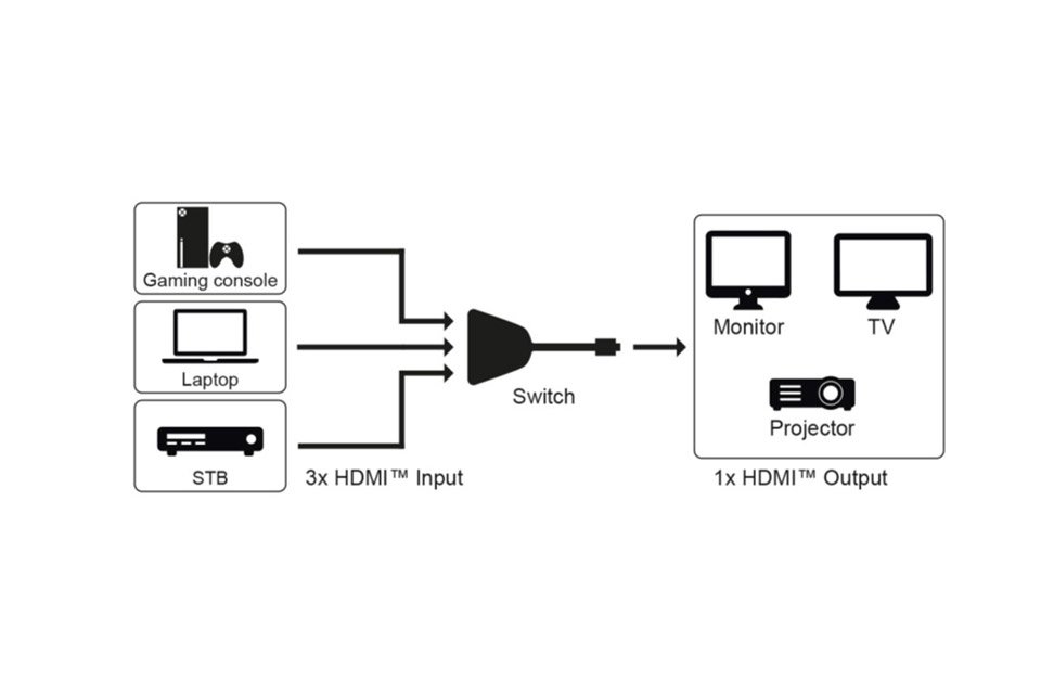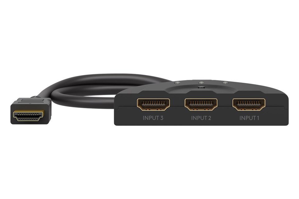 HDMI 2.0 switch with 3 inputs and fixed cable to screen, for easy connection of up to 3 devices to the same screen.