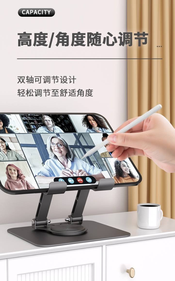 This tablet holder is designed for comfortable and stable use on your desk. The most special part is the 360° rotating base that allows you to adjust the position of the tablet for the most convenient viewing angle.