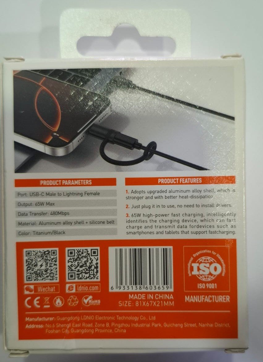The LDNIO LC260 USB-C to Lightning Converter is a compact adapter that lets you use your existing USB-C charger or cable to power and charge Lightning-equipped Apple devices. Designed for convenience and performance, this converter supports up to 65W Power Delivery, enabling fast charging when paired with a compatible USB-C power source and Lightning cable.
