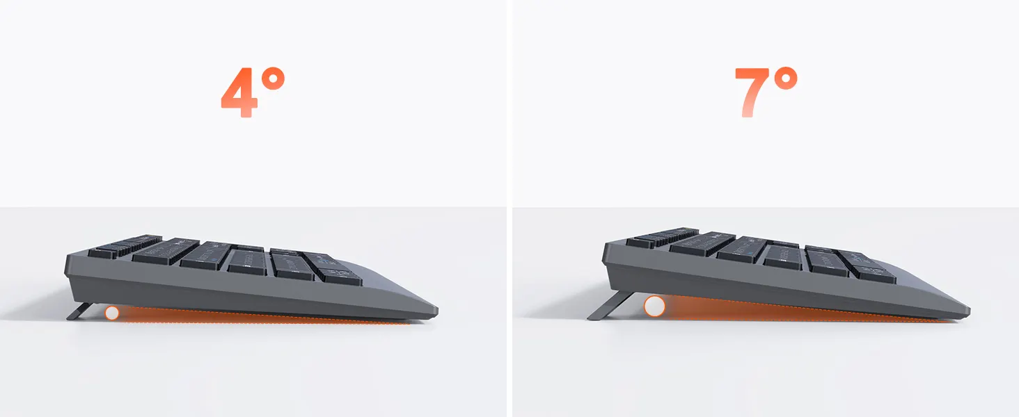 Adjustable Feet will allow you to tilt 7° the keyboard in different angle. Adjust according to your need and type for long hours