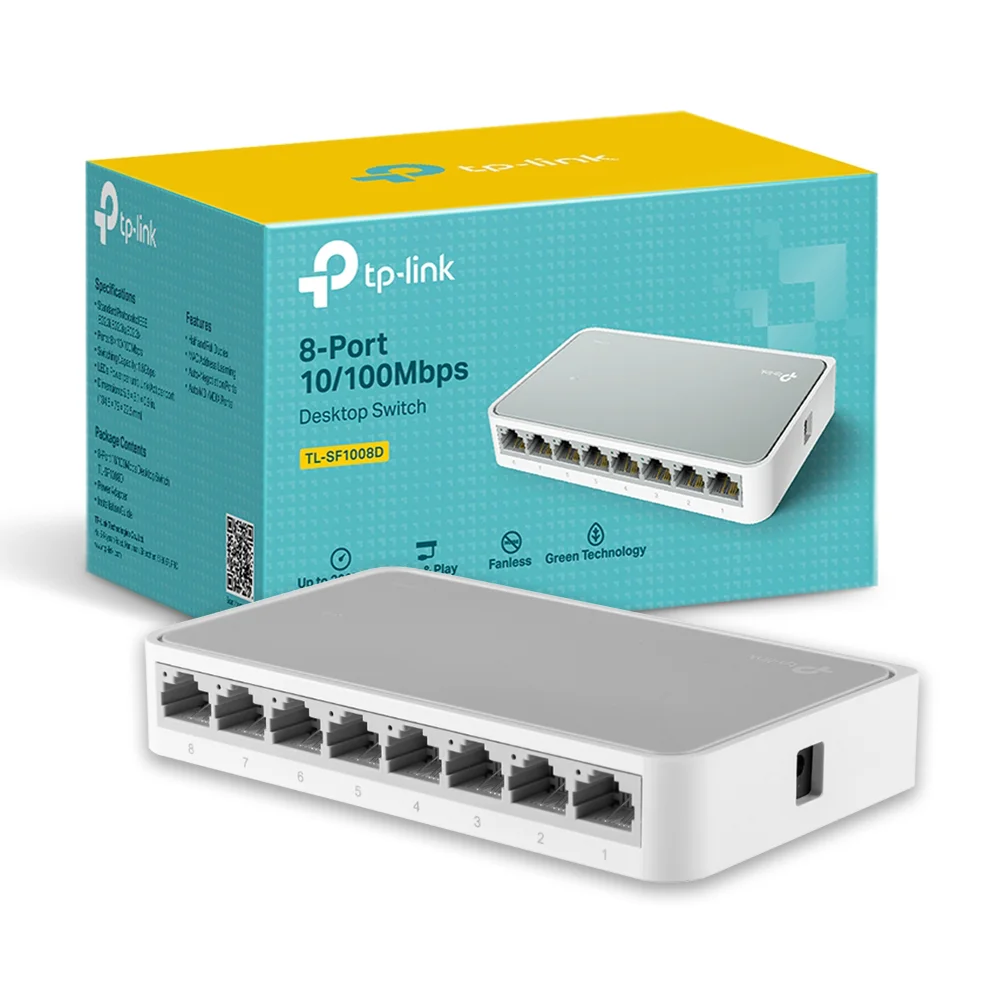 The TL-SF1008D Fast Ethernet Switch is designed for SOHO (Small Office/Home Office) or workgroup users.. All 8 ports support auto MDI/MDIX, no need to worry about the cable type, simply plug and play. Moreover, with the innovative energy-efficient technology, the TL-SF1008D can save up to 60%* of the power consumption and 70% of the packaging material can be recycled, making it an eco-friendly solution for your business network.