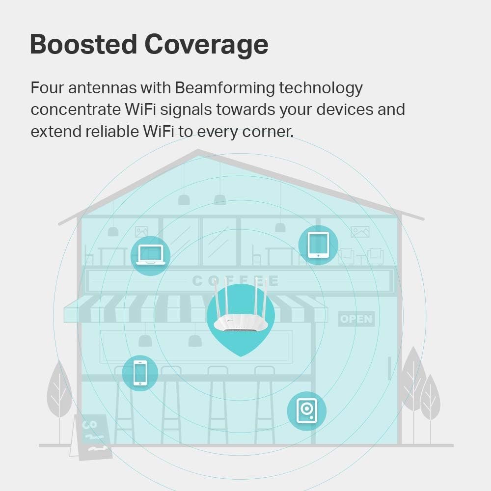 Four external antennas equipped with Beamforming technology concentrate Wi-Fi signals towards your devices to extend reliable Wi-Fi to every corner of your home or office—even over long distances.