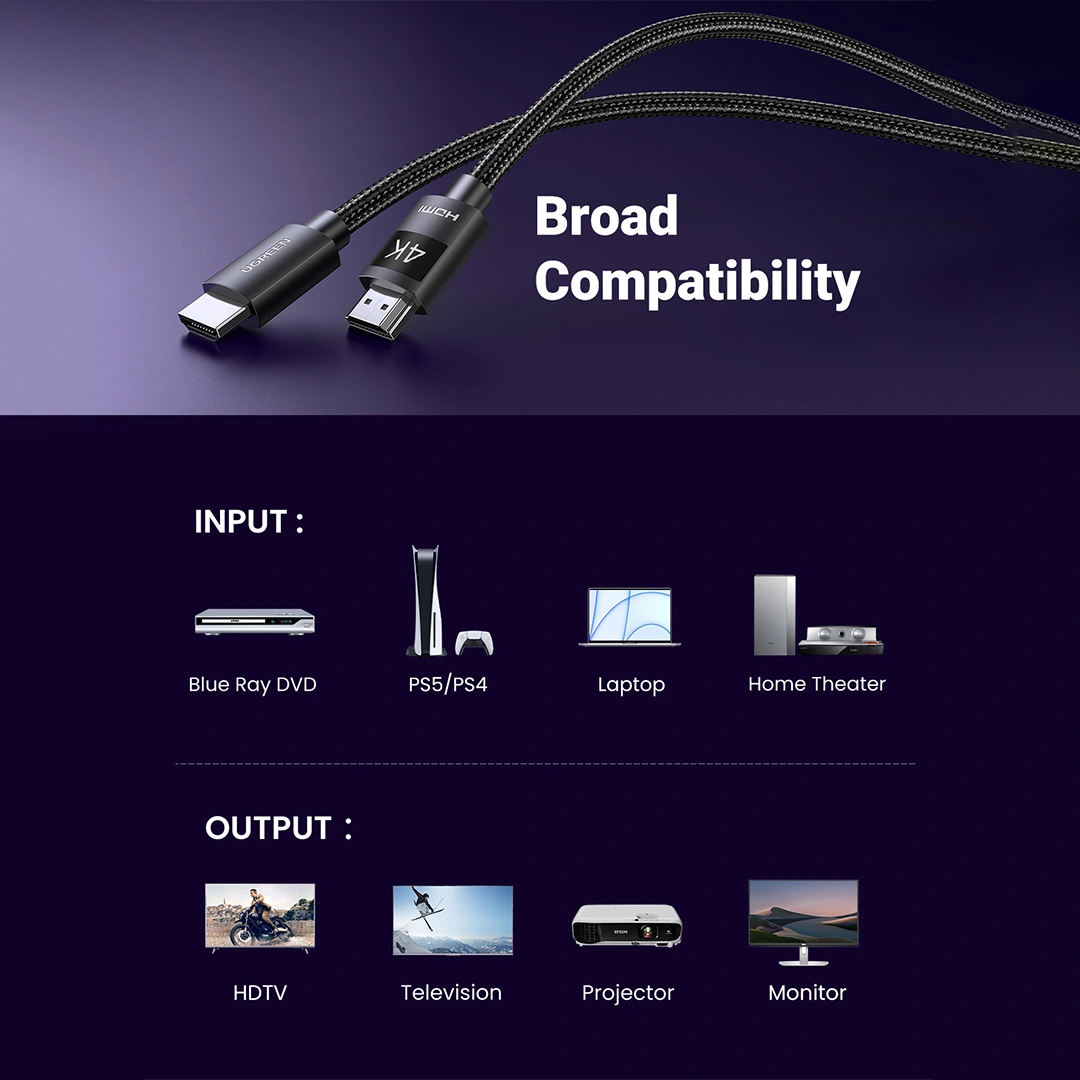 Experience stunning high-definition visuals with the UGREEN 4K HDMI Cable (HD119). Designed for exceptional durability and performance, this 2-meter nylon-braided HDMI cable supports 4K UHD resolution and crystal-clear audio — making it perfect for TVs, monitors, gaming consoles, and projectors.