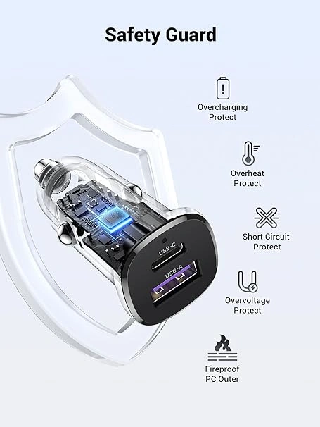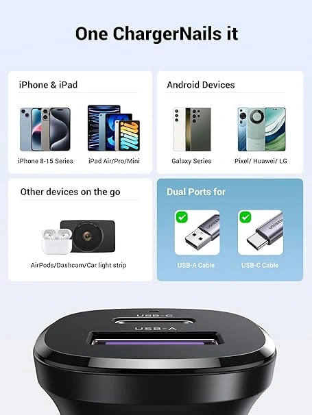 Charge your devices efficiently on the go with the UGREEN EC305 (25845) 30W Dual-Port Car Charger. Featuring USB-C PD and USB-A QC ports, it ensures fast and safe charging for all your gadgets.